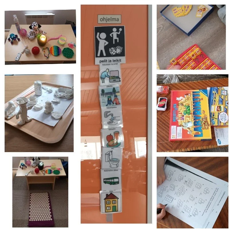 Herkullisen lounaan ja hengähdystauon jälkeen oli vuorossa kivoja yhteisiä rastitehtäviä, joita lapset kiersivät huonekaverin kanssa. Tehtävänä oli Hannan kanssa muovailla massasta erilaisia hahmoja ja koristeita, kokeilla satujoogaa Merjan ohjeiden siivittämänä, ratkoa erilaisia aivopähkinöitä Sinin ja Eijan avustuksella sekä pelailla erilaisia lautapelejä Eveliinan ja Laithin kanssa. Rasteja suoritettiin innokkaasti. Aistihuone oli yksi kiinnostavimmista jutuista lapsille ja huone olikin kovalla käytöllä koko viikonlopun ajan. Aistihuoneesta löytyi muun muassa projektori, piikkimatto, aistigeeli, hierontatuoli, hierontapalloja, erilaisia tärinä- ja stimmausleluja. Järjestetyn ohjelman rinnalla painotimme vapaata leikkiä ja touhuilua, jotta kuormittumiselle saadaan vastapainoa. Tauoilla sai värittää, piirtää, pelata lautapelejä, leikkiä ja lukea. Lapset etsivät toimintaa omien kiinnostuksenkohteiden mukaisesti. Varsinkin rosvo- ja piiloleikki sekä erilaiset pulma- ja lautapelit olivat kovassa käytössä. Opetimme myös lapsia pelaamaan perinteistä mökkipeliä sekä ristiviivapistepeliä. Välipalan jälkeen lähdimme ulkoilemaan uudestaan. Lapset valloittivat isoja lumivuoria, tekivät lumienkeleitä ja märästä lumesta sai tehtyä myös lumitaideteoksia. Ulkoilun jälkeen päivällinen maistui ja yhteiseen iltaohjelmaamme kuului bingo, josta jokainen lapsi sai pienen palkinnon myös kotiin viemiseksi. Iltapalaksi lapset tekivät lämpimiä voileipiä. Iltasaduksi kuuntelimme jälleen Kuparikettua ja osa leiriläisistä tykkäsi, kun hieroimme heitä sadun aikana hierontapalloilla. Osa taisi nukahtaa jo sadun aikana 😊. Ilta oli perjantaita rauhallisempi aktiivisen päivän jälkeen.