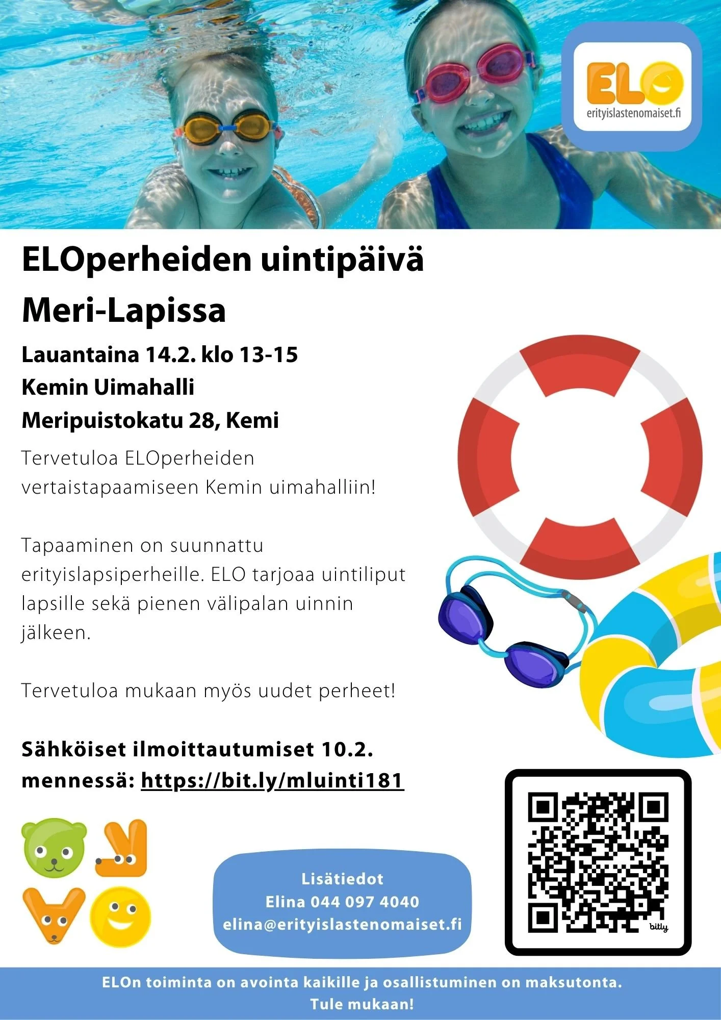 Tapaaminen on suunnattu erityislapsiperheille. ELO tarjoaa uintiliput lapsille sekä pienen välipalan uinnin jälkeen.