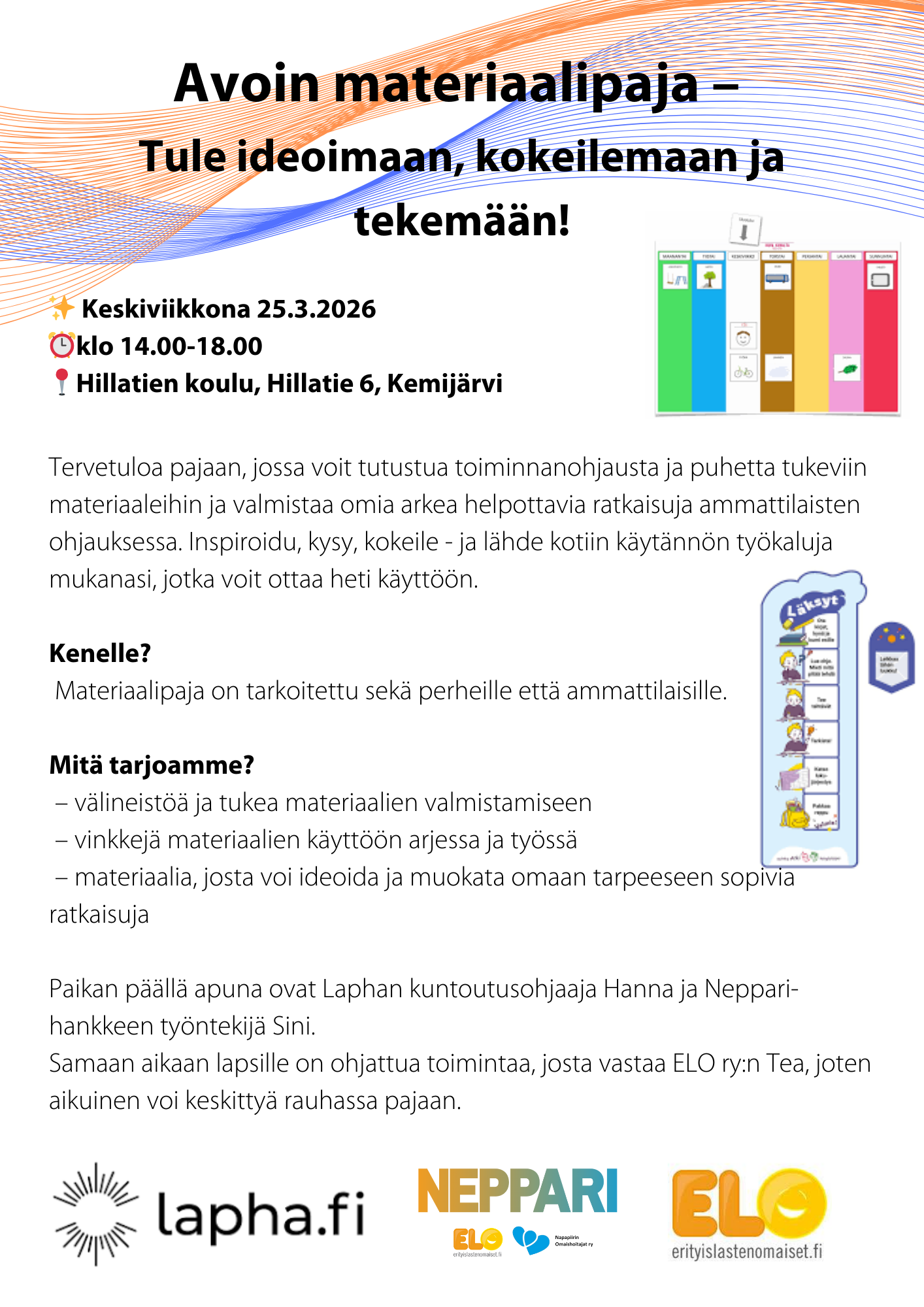 Tervetuloa pajaan, jossa voit tutustua toiminnanohjausta ja puhetta tukeviin materiaaleihin ja valmistaa omia arkea helpottavia ratkaisuja ammattilaisten ohjauksessa. Inspiroidu, kysy, kokeile - ja lähde kotiin käytännön työkaluja mukanasi, jotka voit ottaa heti käyttöön.