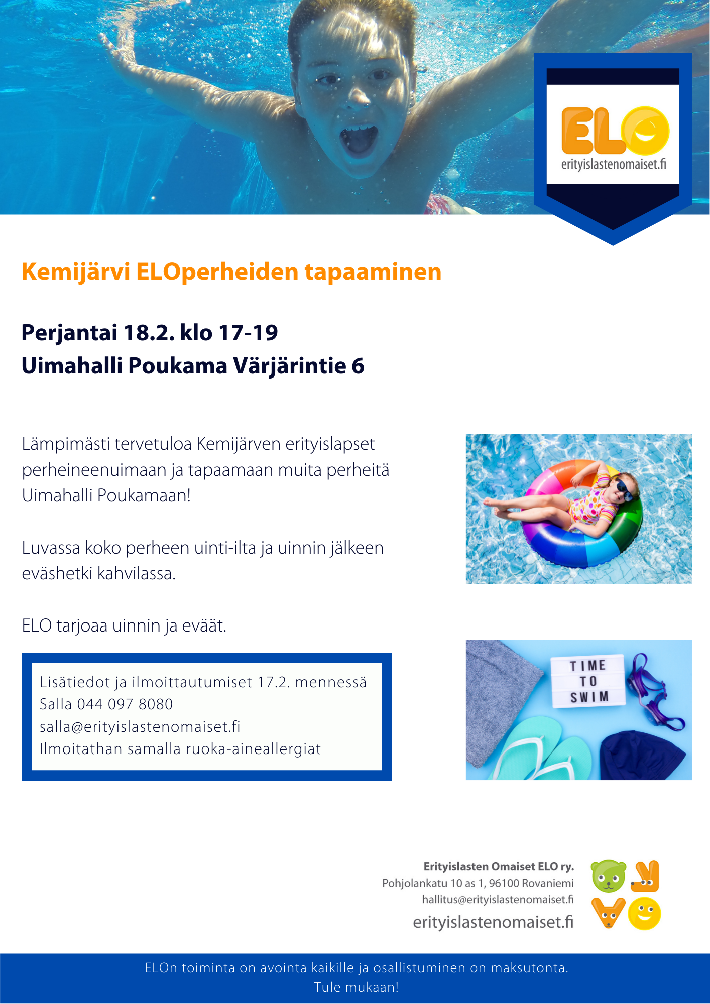 Lämpimästi tervetuloa Kemijärven erityislapset perheineenuimaan ja tapaamaan muita perheitä Uimahalli Poukamaan!
