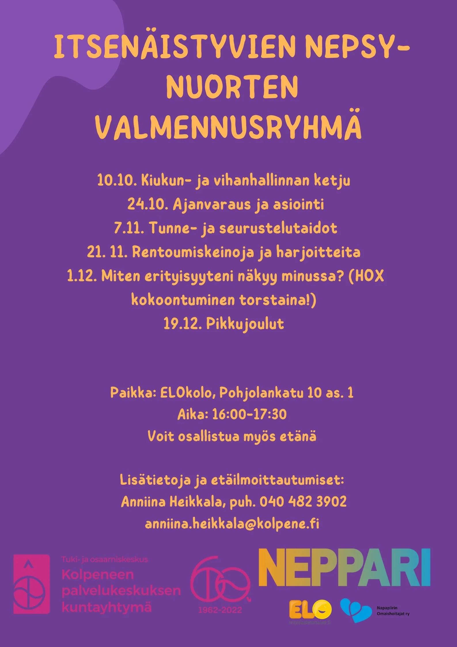 Itsenäistyvien nepsy- nuorten valmennusryhmä kokoontuu kahdesti kuukaudessa ELOkololla erilaisten teemojen äärelle. Tähän ryhmään voit osallistua etänä tai paikan päällä, sinua kiinnostavien aiheiden mukaisesti. Lisätietoja ryhmästä antaa: Anniina Heikkala, puh. 040-4823902 / anniina.heikkala@kolpene.fi