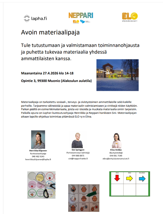 Järjestämme satunnaisesti pop-up-tyyppisiä materiaalipajoja eri puolilla Lappia. Pajoissa pääset tutustumaan toiminnanohjausta ja puhetta tukeviin materiaaleihin sekä valmistamaan omia arkea helpottavia ratkaisuja ammattilaisten ohjauksessa.