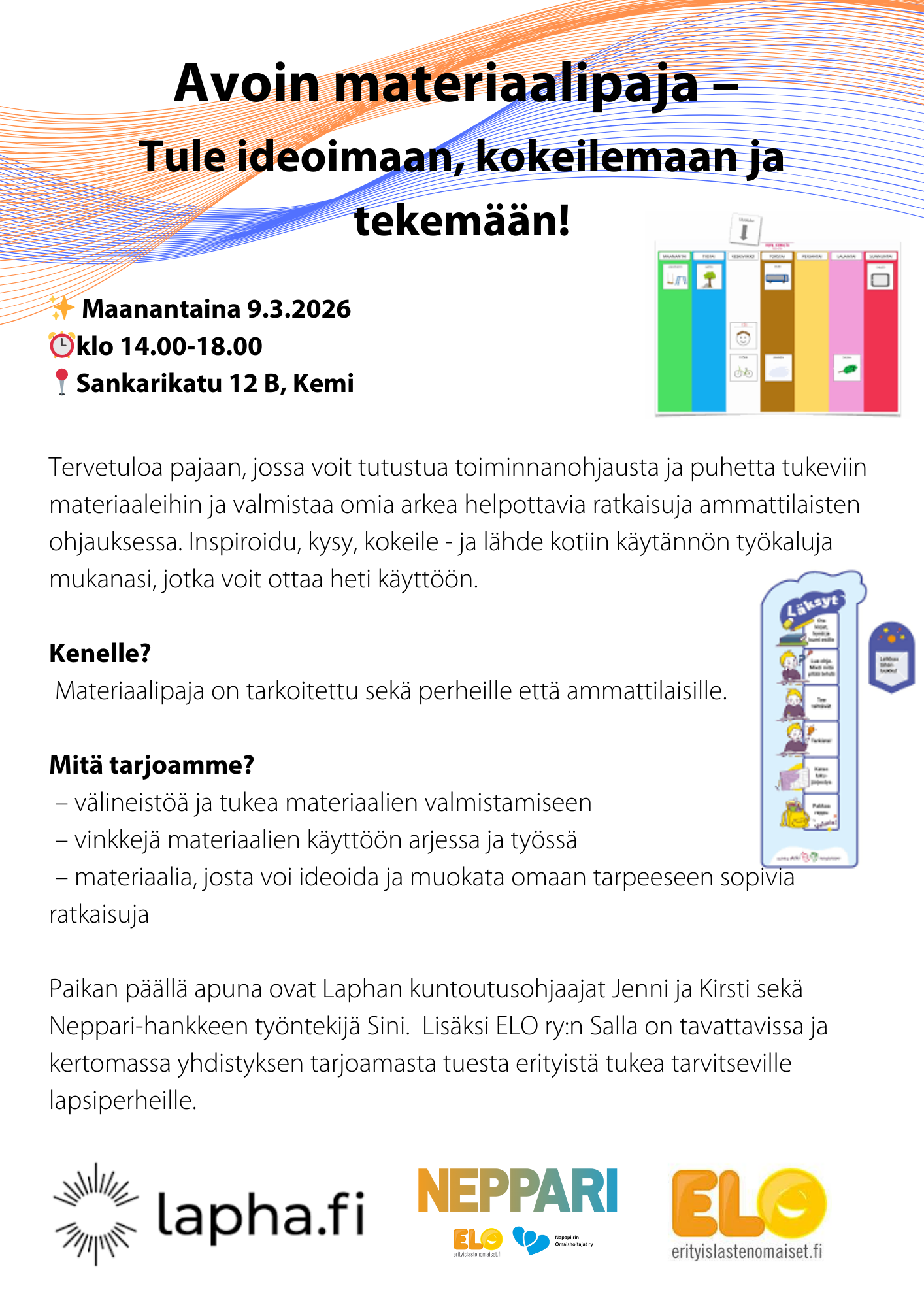 Järjestämme satunnaisesti pop-up-tyyppisiä materiaalipajoja eri puolilla Lappia. Pajoissa pääset tutustumaan toiminnanohjausta ja puhetta tukeviin materiaaleihin sekä valmistamaan omia arkea helpottavia ratkaisuja ammattilaisten ohjauksessa.
