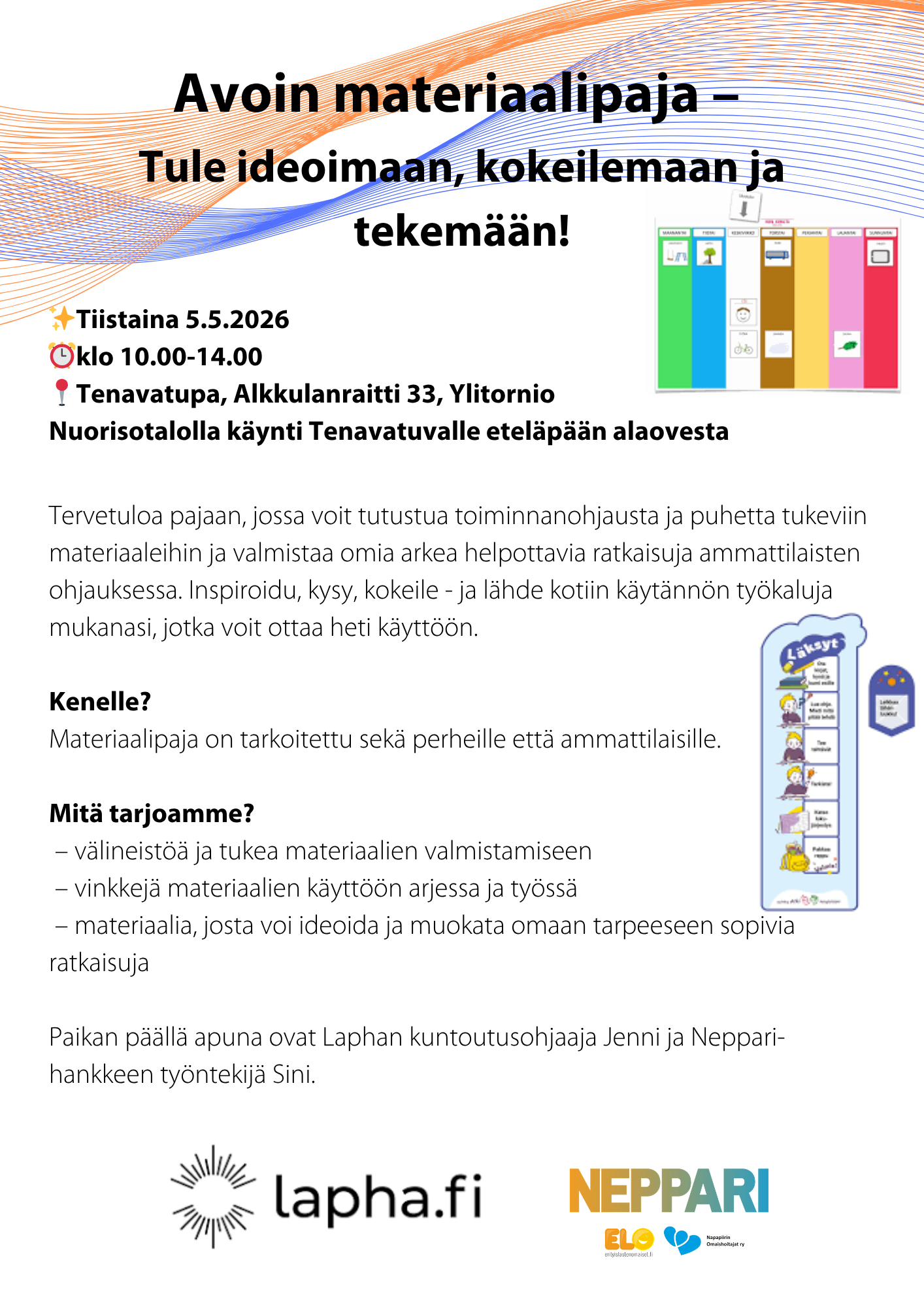 Järjestämme satunnaisesti pop-up-tyyppisiä materiaalipajoja eri puolilla Lappia. Pajoissa pääset tutustumaan toiminnanohjausta ja puhetta tukeviin materiaaleihin sekä valmistamaan omia arkea helpottavia ratkaisuja ammattilaisten ohjauksessa.