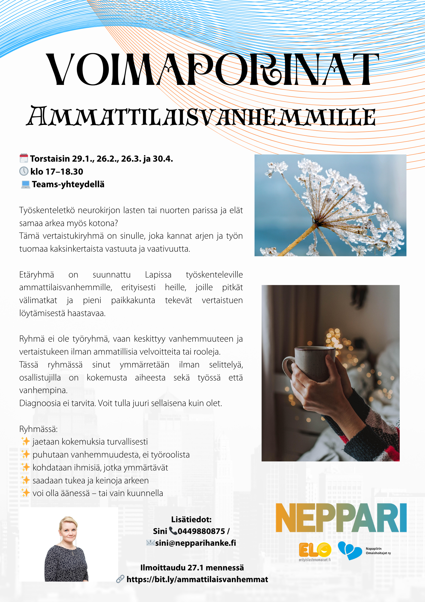 Etäryhmä on suunnattu Lapissa työskenteleville ammattilaisvanhemmille, erityisesti heille, joille pitkät välimatkat tai pieni paikkakunta tekevät vertaistuen löytämisestä haastavaa.