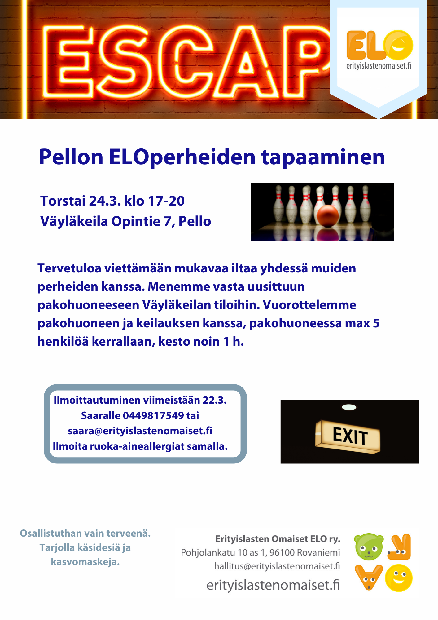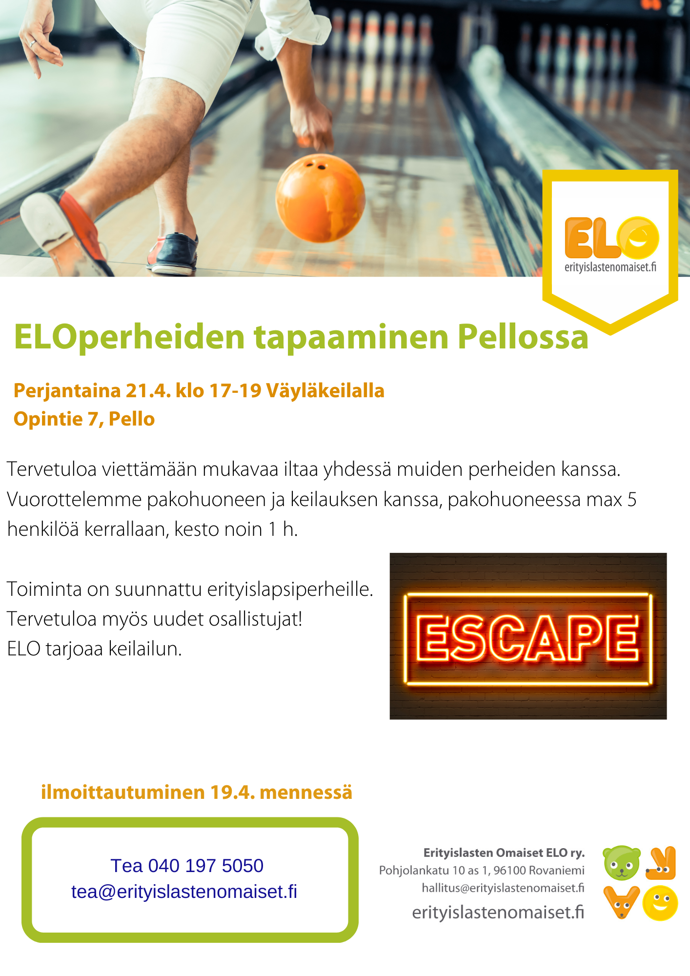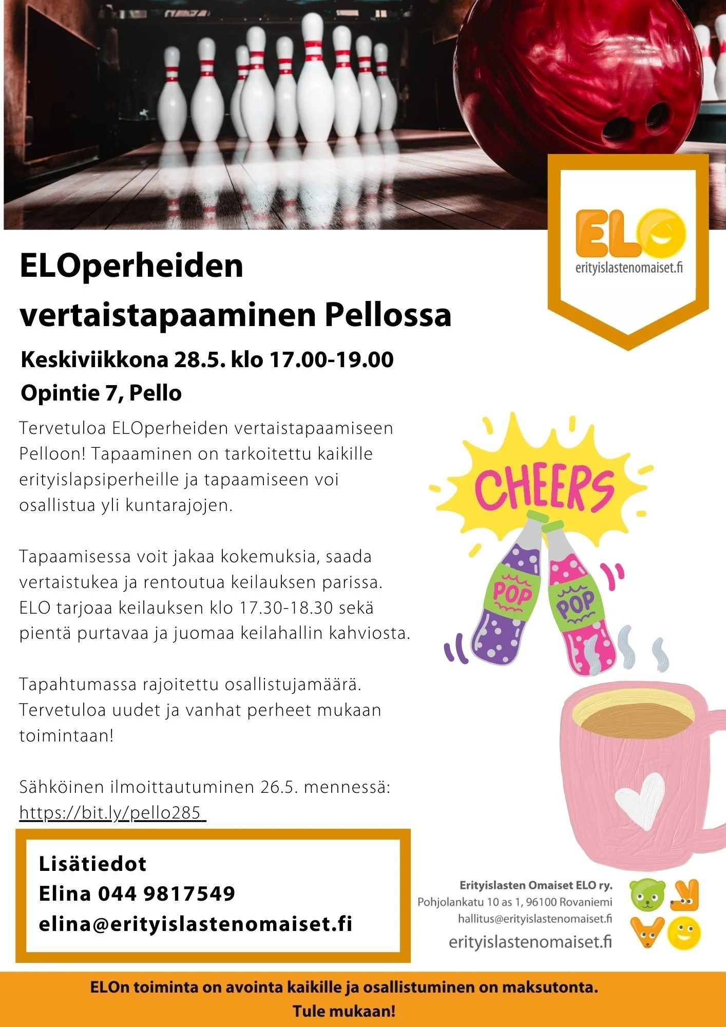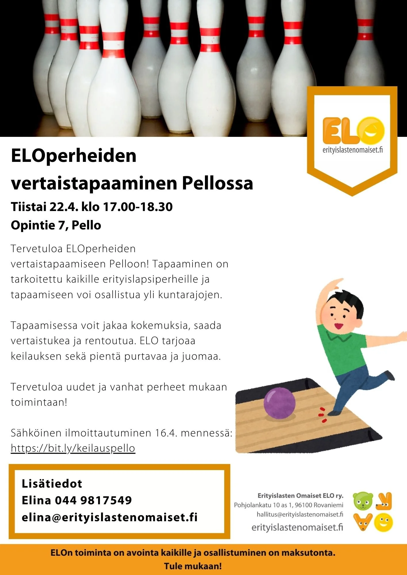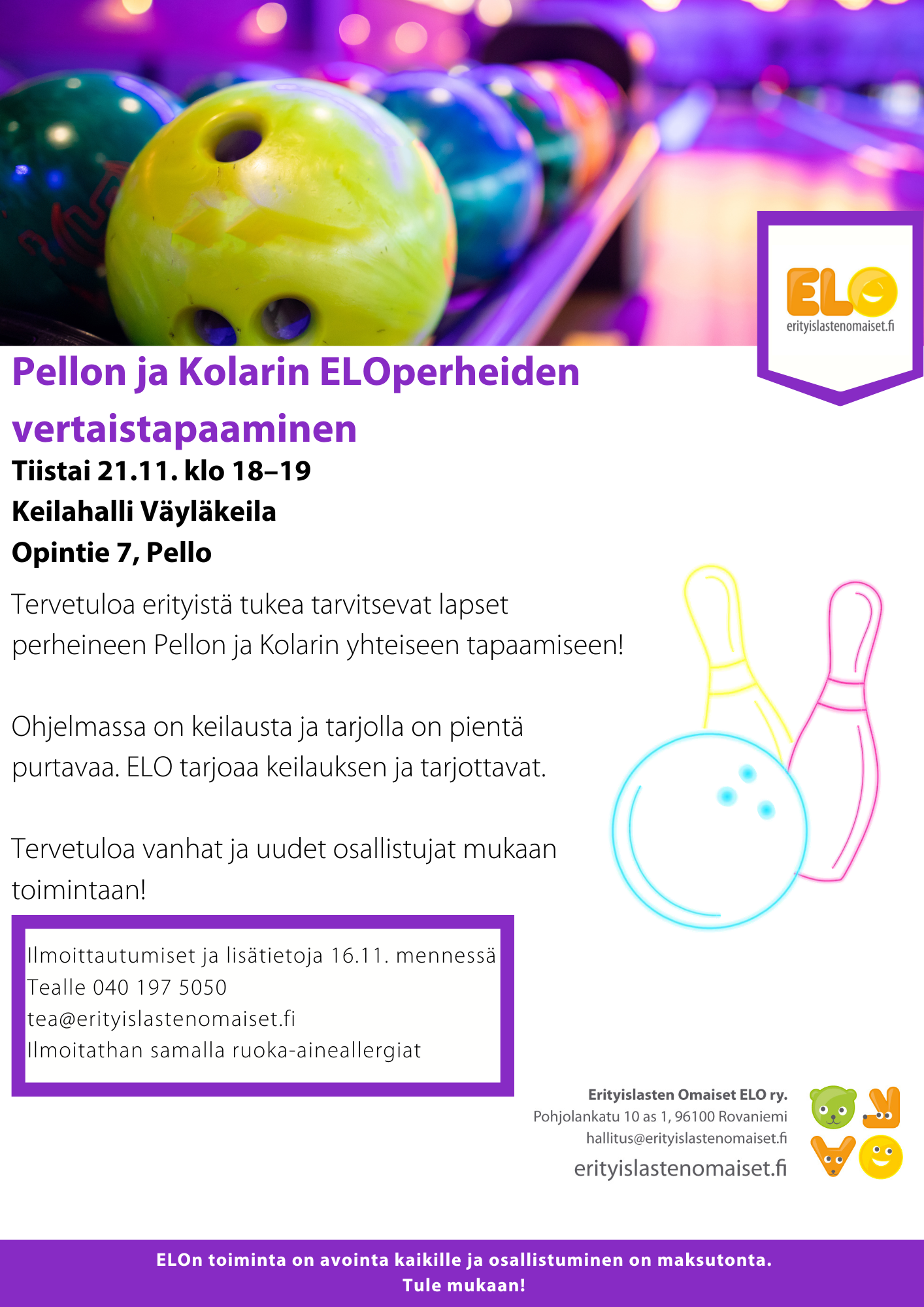 Tapaamisessa voit jakaa kokemuksia, saada vertaistukea ja rentoutua. ELO tarjoaa keilauksen sekä pientä purtavaa ja juomaa.