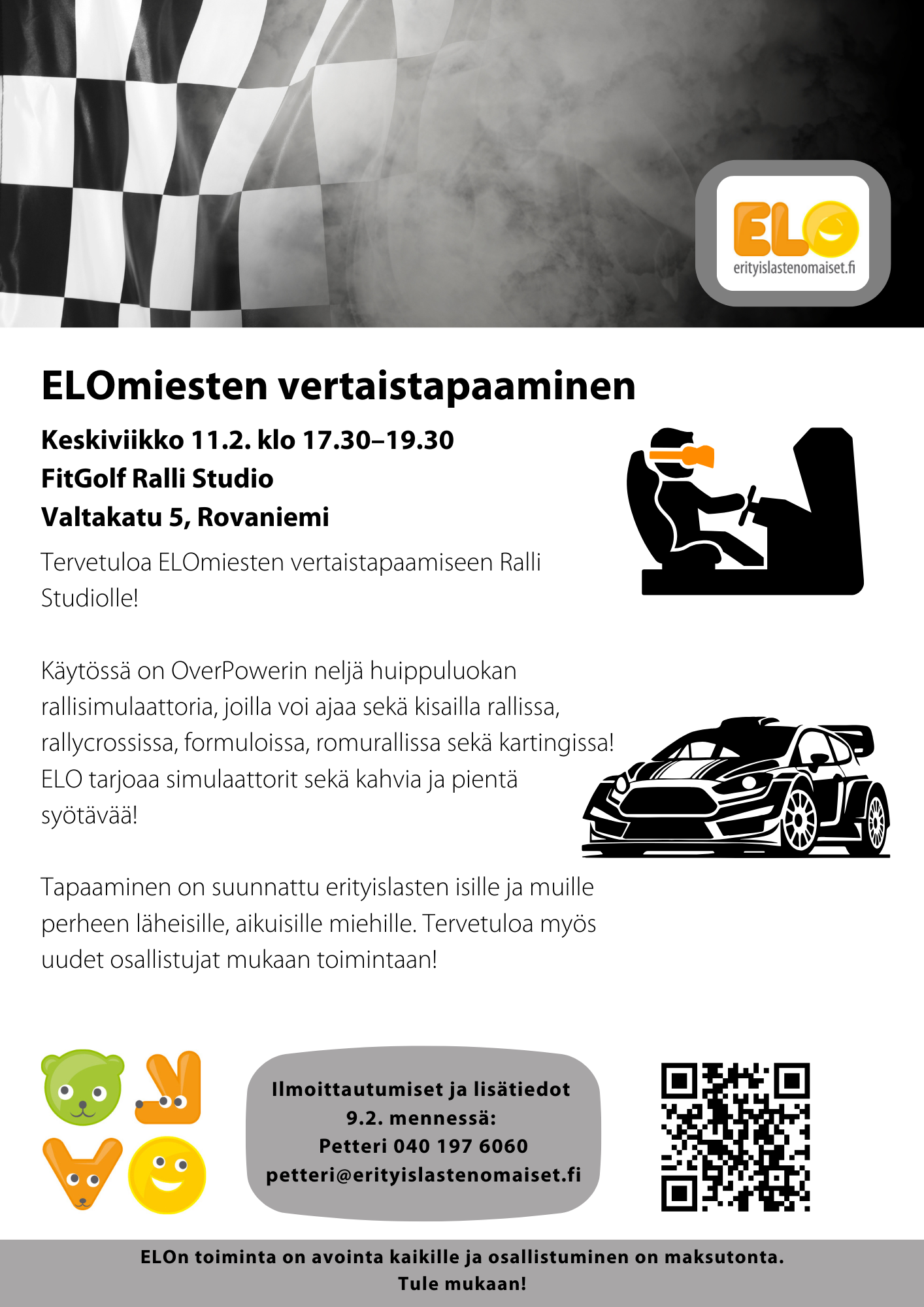 ELO tarjoaa simulaattorit sekä kahvia ja pientä syötävää! Tapaaminen on suunnattu erityislasten isille ja muille perheen läheisille, aikuisille miehille. Tervetuloa myös uudet osallistujat mukaan toimintaan!