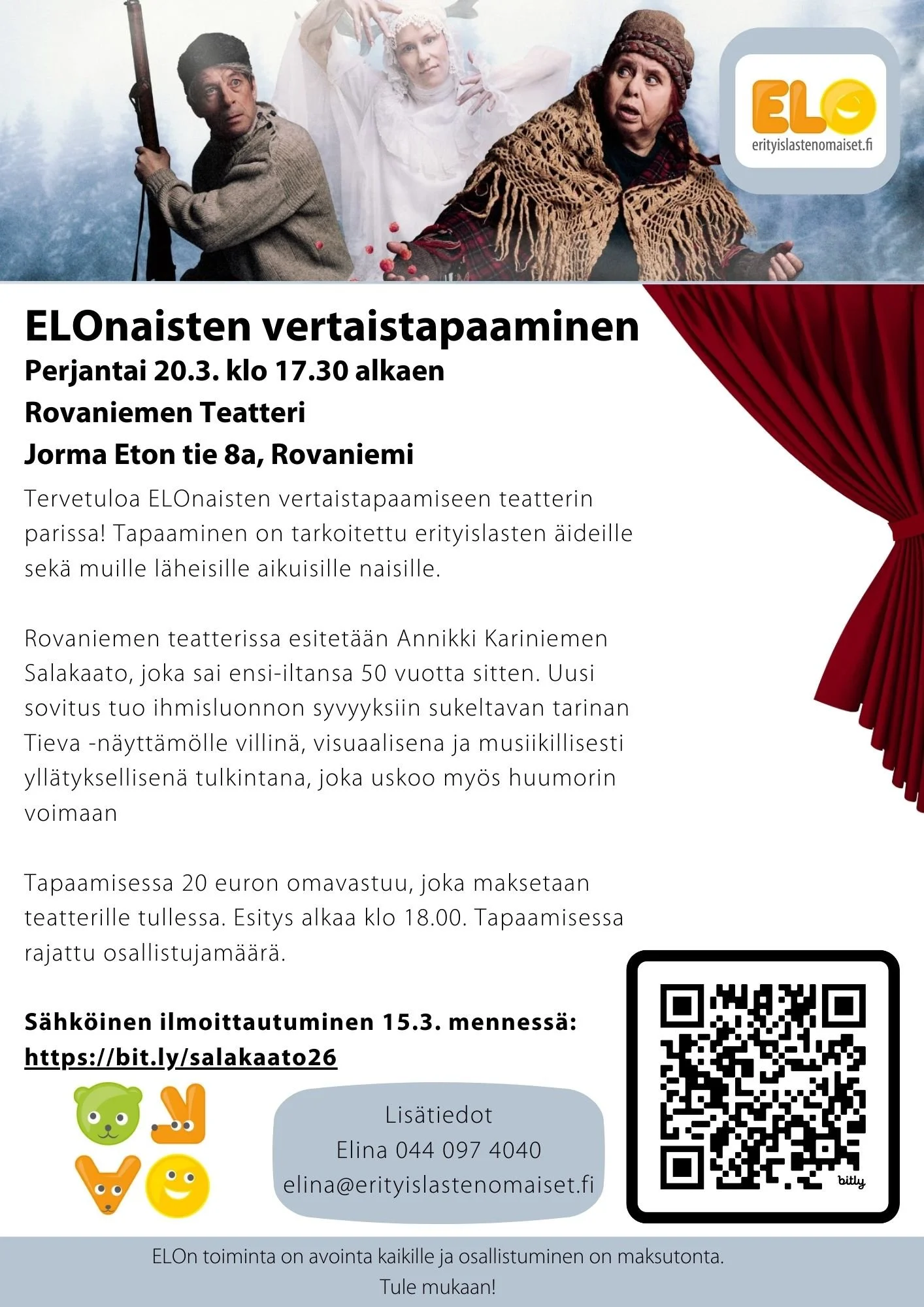 Tervetuloa ELOnaisten vertaistapaamiseen teatterin parissa! Tapaaminen on tarkoitettu erityislasten äideille sekä muille läheisille aikuisille naisille.