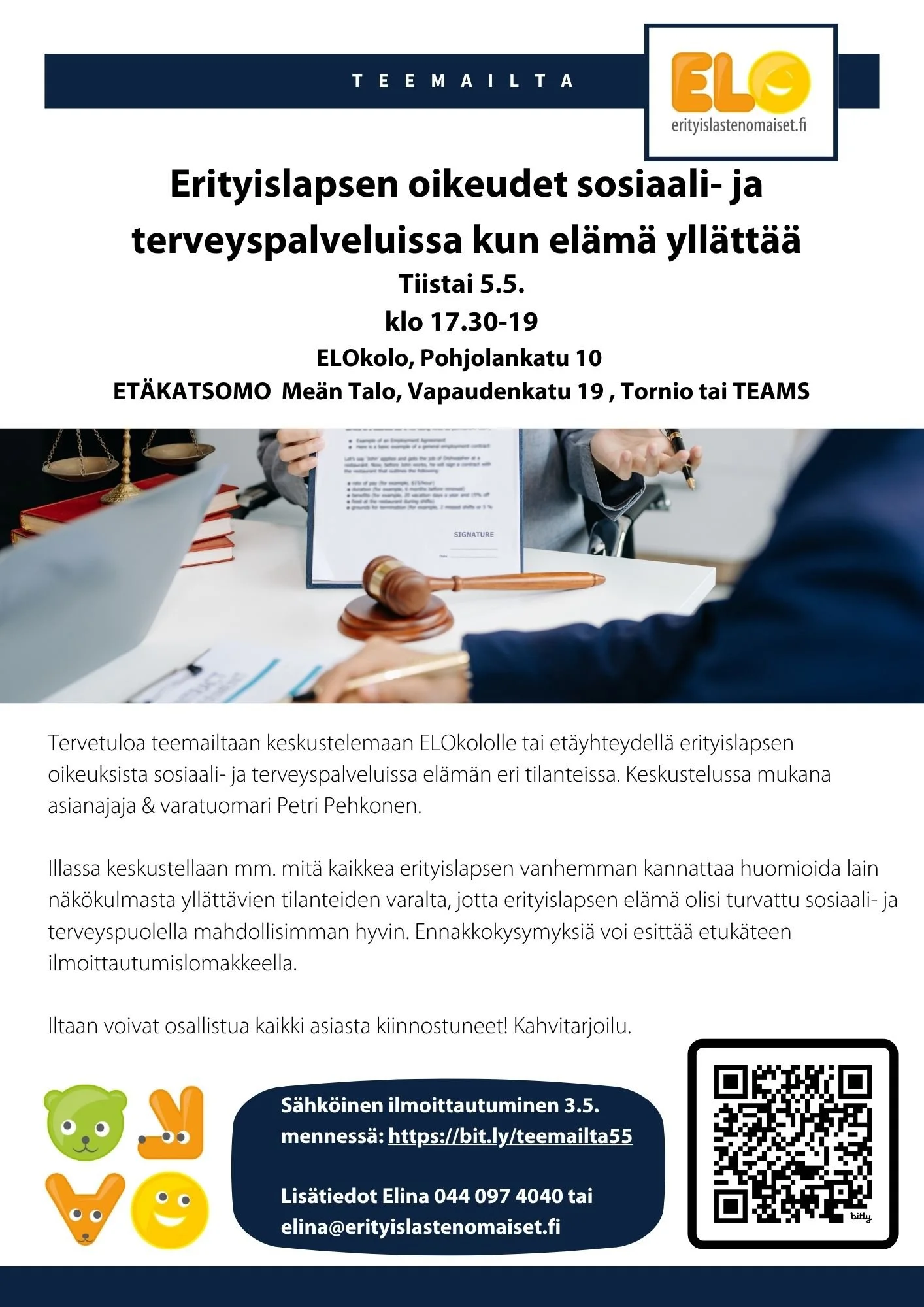 Tervetuloa teemailtaan keskustelemaan ELOkololle tai etäyhteydellä erityislapsen oikeuksista sosiaali- ja terveyspalveluissa elämän eri tilanteissa. Keskustelussa mukana asianajaja & varatuomari Petri Pehkonen.