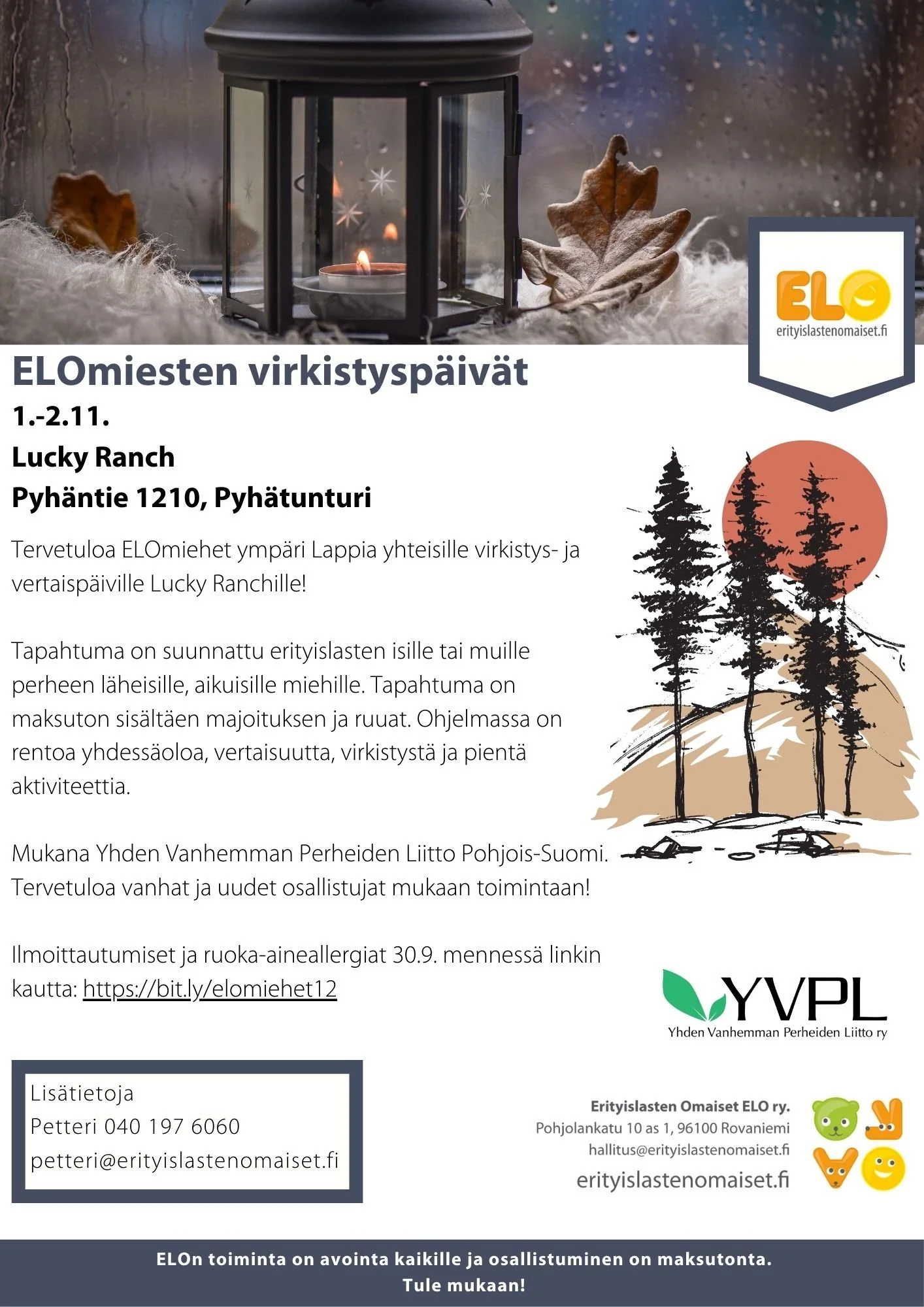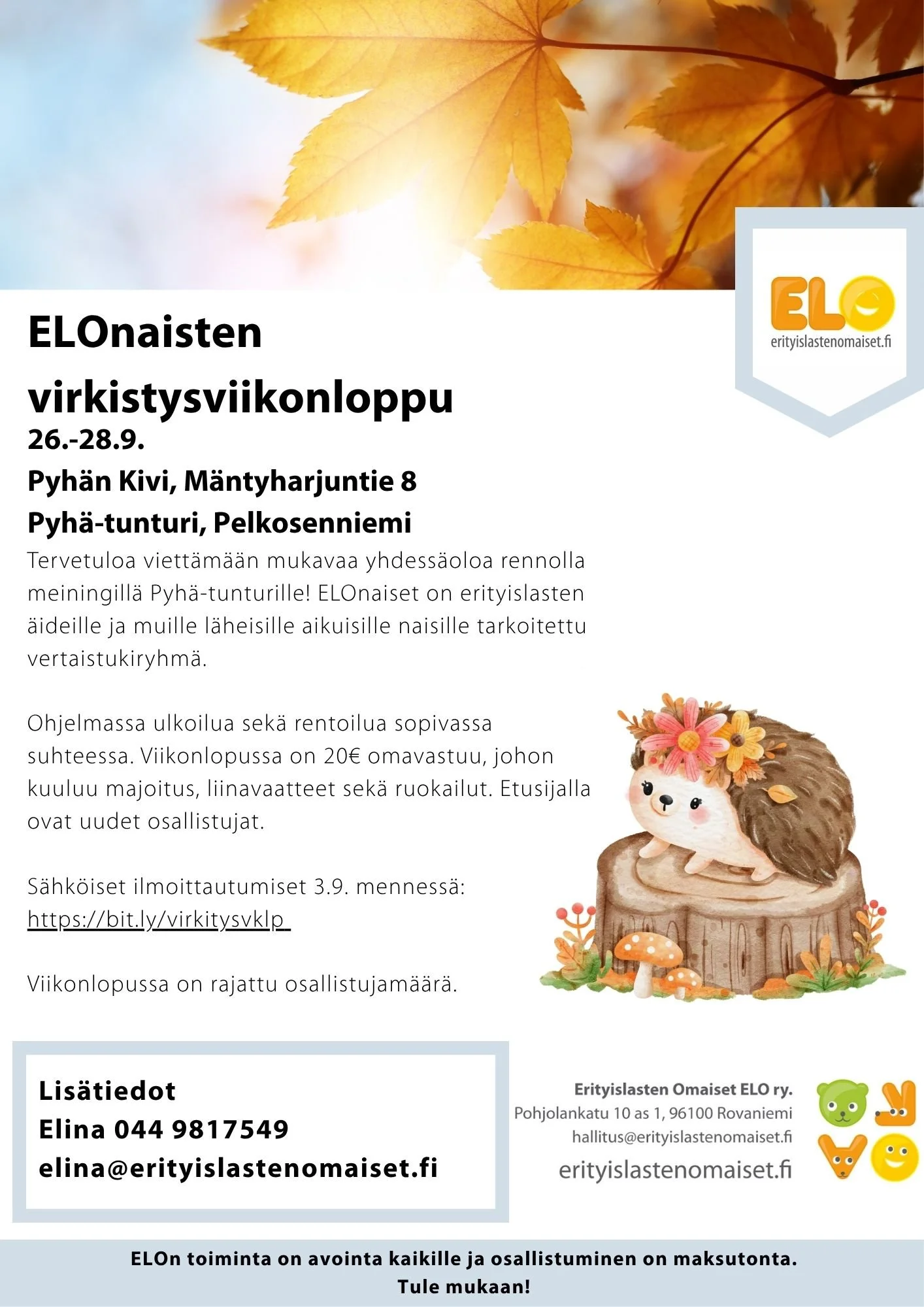 Tervetuloa viettämään mukavaa yhdessäoloa rennolla meiningillä Pyhä-tunturille! ELOnaiset on erityislasten äideille ja muille läheisille aikuisille naisille tarkoitettu vertaistukiryhmä.