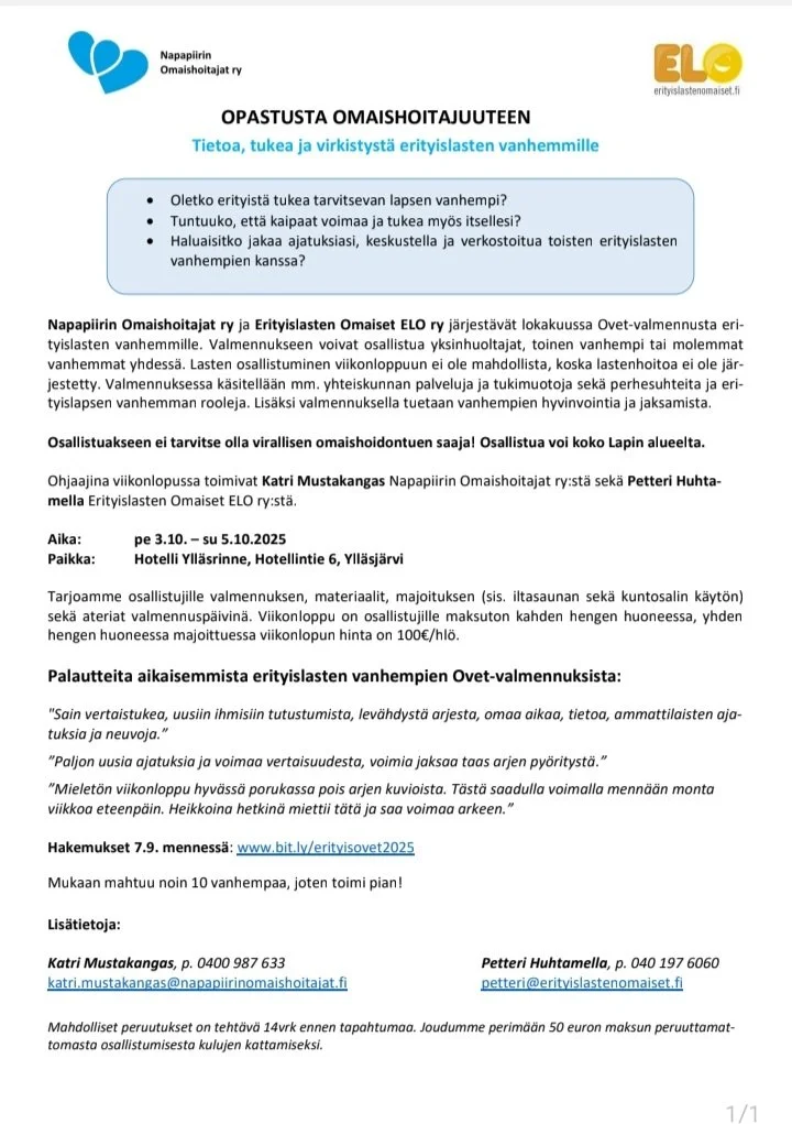Lisätiedot: Elina 044 9817549 / elina@erityislastenomaiset.fi