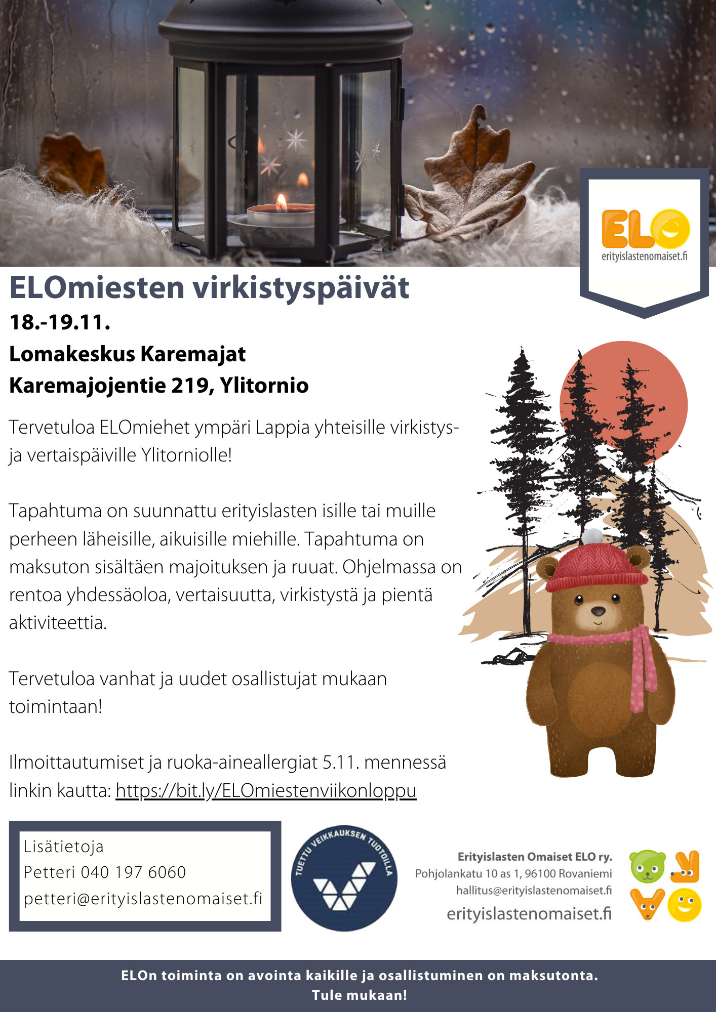Ilmoittautumiset ja ruoka-aineallergiat 5.11. mennessä linkin kautta: https://bit.ly/ELOmiestenviikonloppu