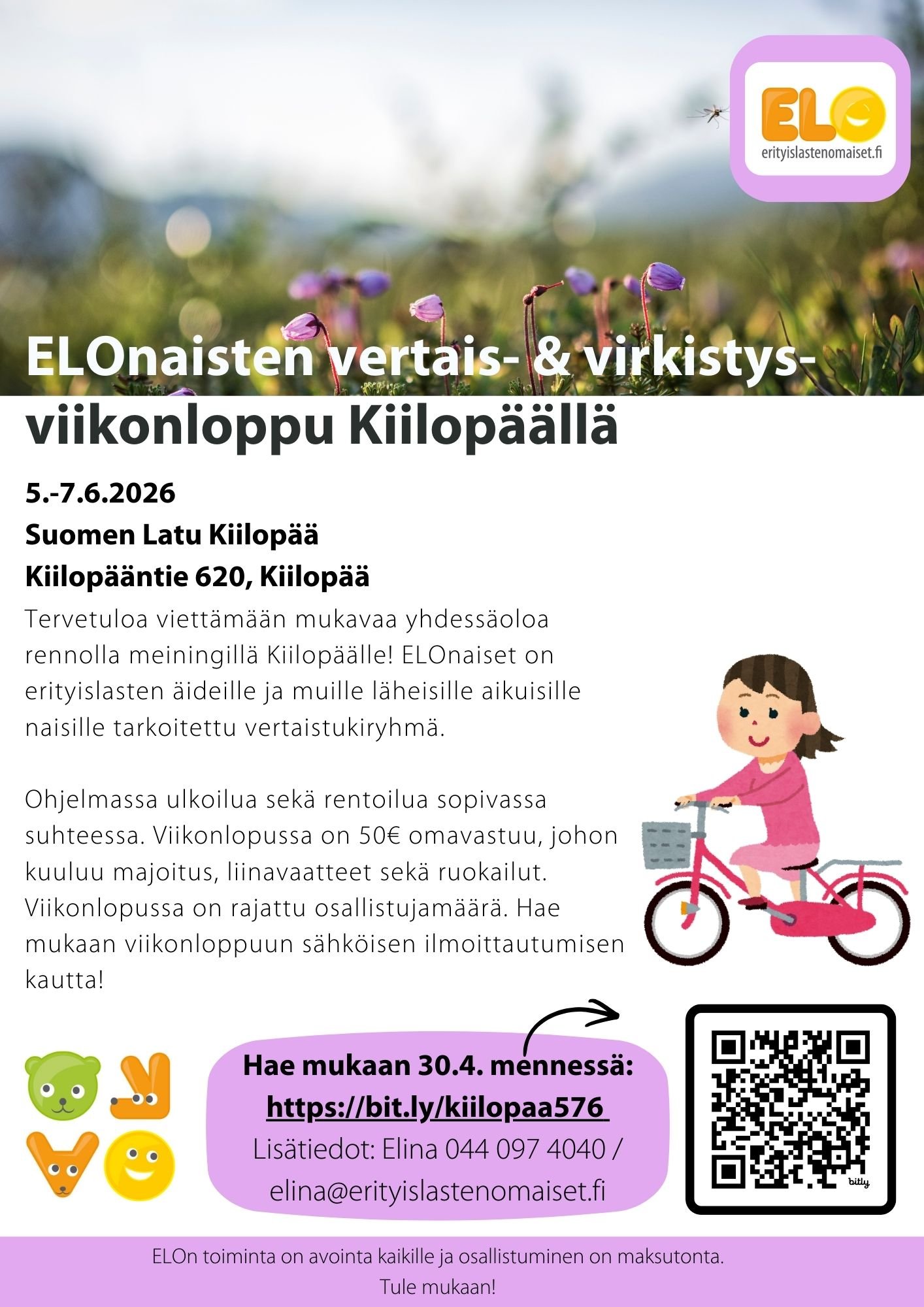 Tervetuloa viettämään mukavaa yhdessäoloa rennolla meiningillä Kiilopäälle! ELOnaiset on erityislasten äideille ja muille läheisille aikuisille naisille tarkoitettu vertaistukiryhmä.