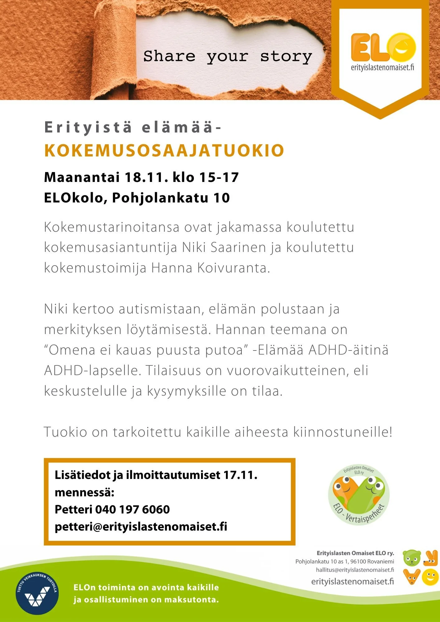 Niki kertoo autismistaan, elämän polustaan ja merkityksen löytämisestä. Hannan teemana on “Omena ei kauas puusta putoa” -Elämää ADHD-äitinä ADHD-lapselle. Tilaisuus on vuorovaikutteinen, eli keskustelulle ja kysymyksille on tilaa.
