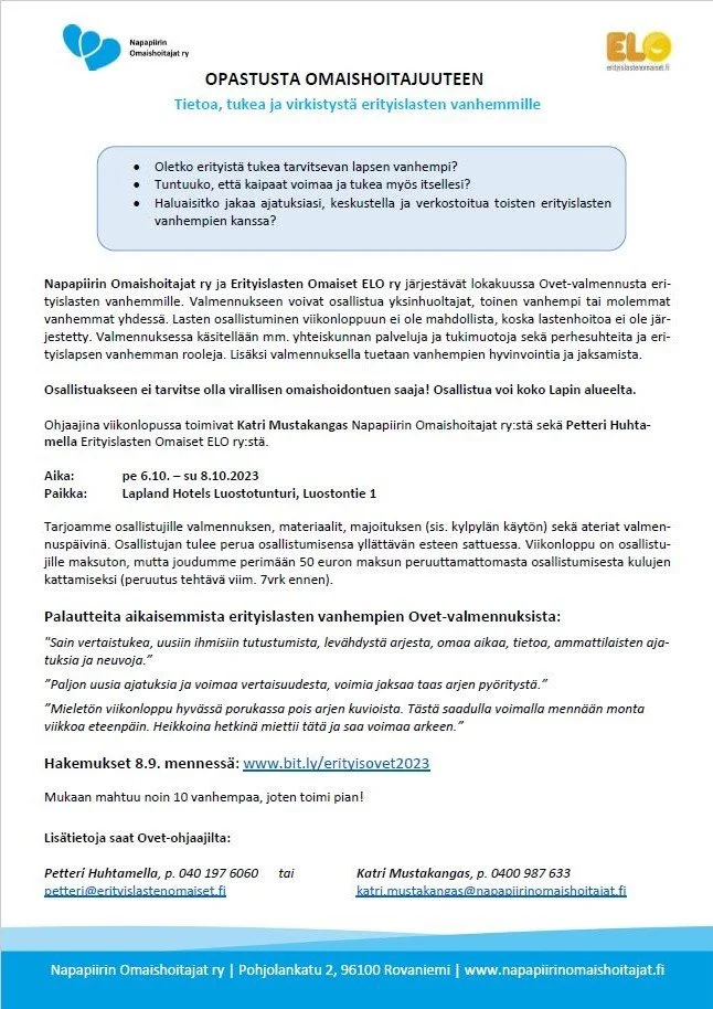 Napapiirin Omaishoitajat ry ja Erityislasten Omaiset ELO ry järjestävät lokakuussa Ovet-valmennusta erityislasten vanhemmille. Valmennukseen voivat osallistua yksinhuoltajat, toinen vanhempi tai molemmat vanhemmat yhdessä. Lasten osallistuminen viikonloppuun ei ole mahdollista, koska lastenhoitoa ei ole järjestetty. Valmennuksessa käsitellään mm. yhteiskunnan palveluja ja tukimuotoja sekä perhesuhteita ja erityislapsen vanhemman rooleja. Lisäksi valmennuksella tuetaan vanhempien hyvinvointia ja jaksamista.