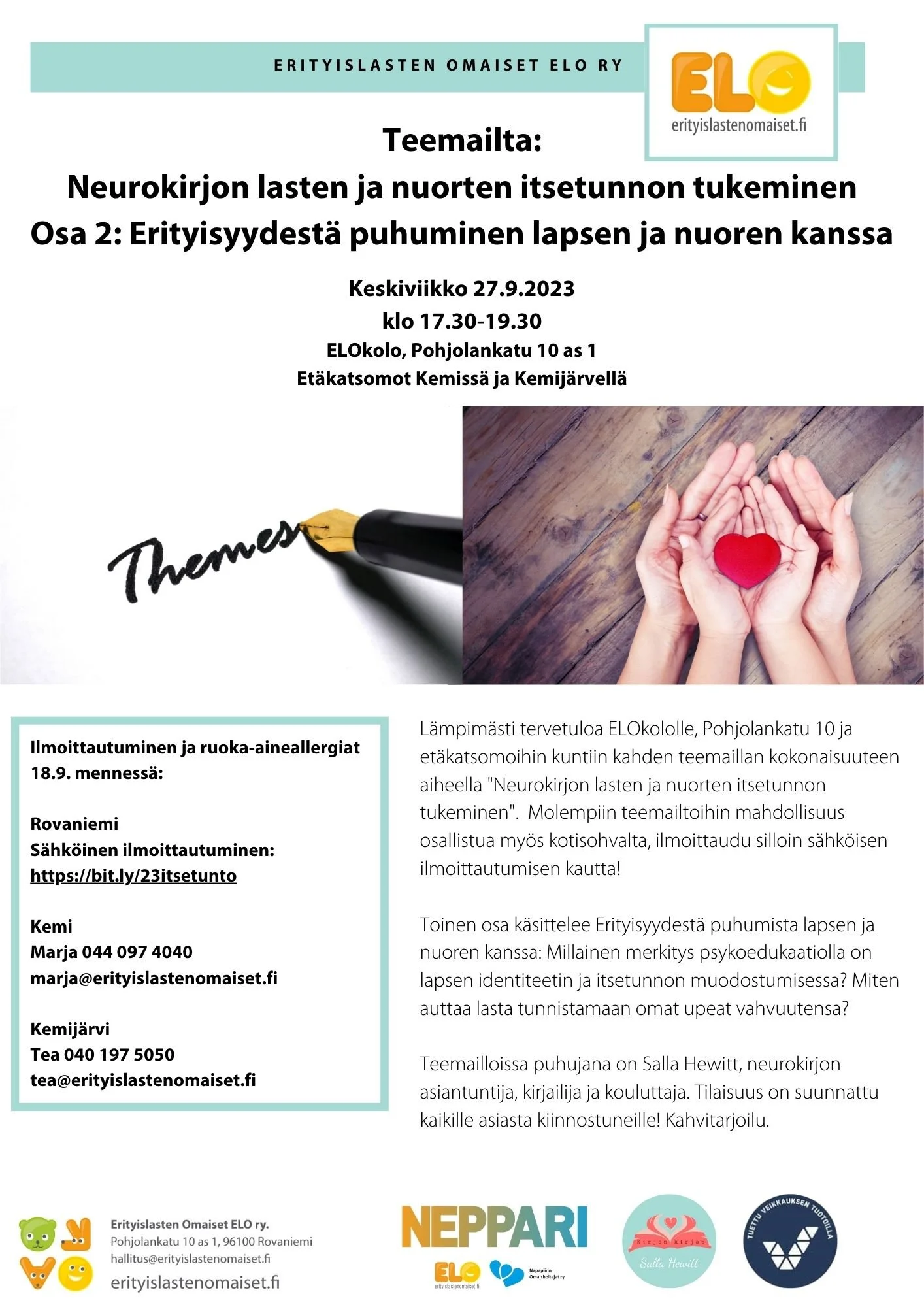 Lämpimästi tervetuloa ELOkololle, Pohjolankatu 10 ja etäkatsomoihin kuntiin kahden teemaillan kokonaisuuteen aiheella "Neurokirjon lasten ja nuorten itsetunnon tukeminen". Molempiin teemailtoihin mahdollisuus osallistua myös kotisohvalta, ilmoittaudu silloin sähköisen ilmoittautumisen kautta!