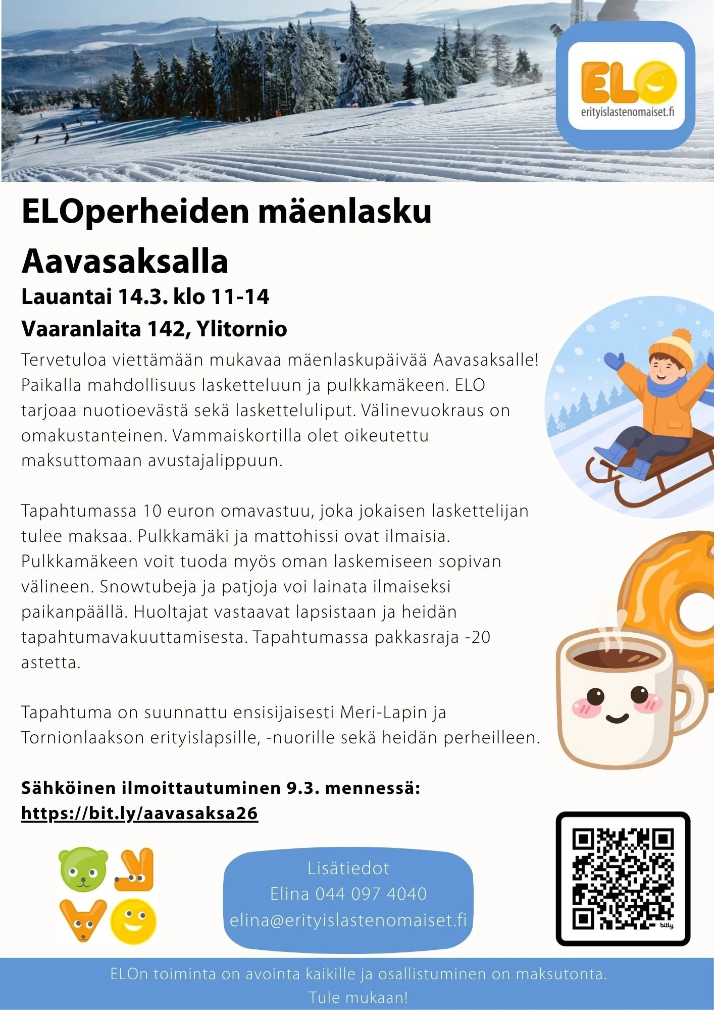 Tervetuloa viettämään mukavaa mäenlaskupäivää Aavasaksalle! Paikalla mahdollisuus lasketteluun ja pulkkamäkeen. ELO tarjoaa nuotioevästä sekä lasketteluliput. Välinevuokraus on omakustanteinen. Vammaiskortilla olet oikeutettu maksuttomaan avustajalippuun.